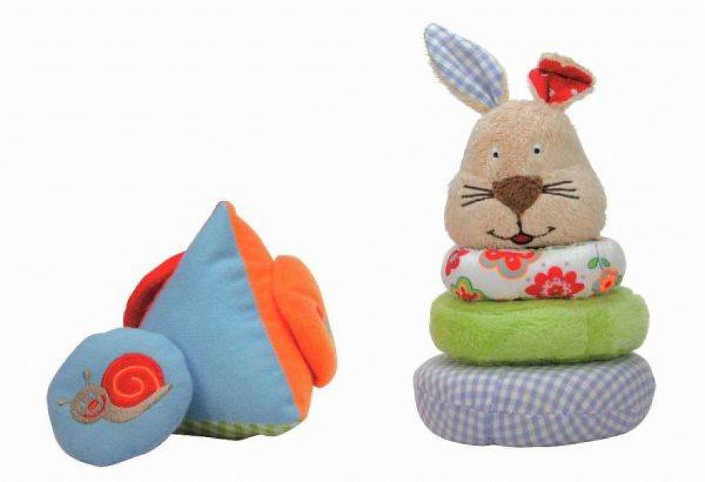 Sada dvou hraček v taštičce vhodné na cesty. Výška zajíčka 14 cm. Snadno můžete rozložit a složit kruhy na sebe. Zábavná hra pro ty nejmenší. Příjemné materiály.